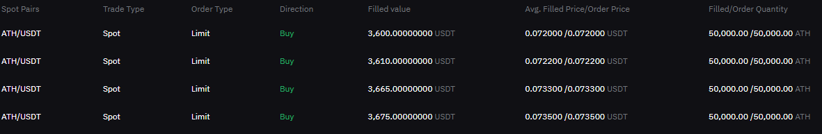 5만개씩 4번, 총 20만개 매수. 수수료는 0.1% (비싸다...ㅠㅠ) 그래서 50,000개를 사면 50개가 덜 들어온다. usdt 가 수수료로 차감되는게 아니라 해당 매수 코인이 수수료만큼 없어진다. 14550 테더 소요. 35000테더를 준비는 했지만, 왠지 다 사기는 좀 무서웠다.