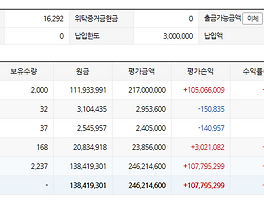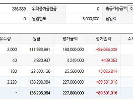 | 주식평가금액 | 현금 | 총평가금액 | 투자금액 | 수익률 | 배당금 수령분 |